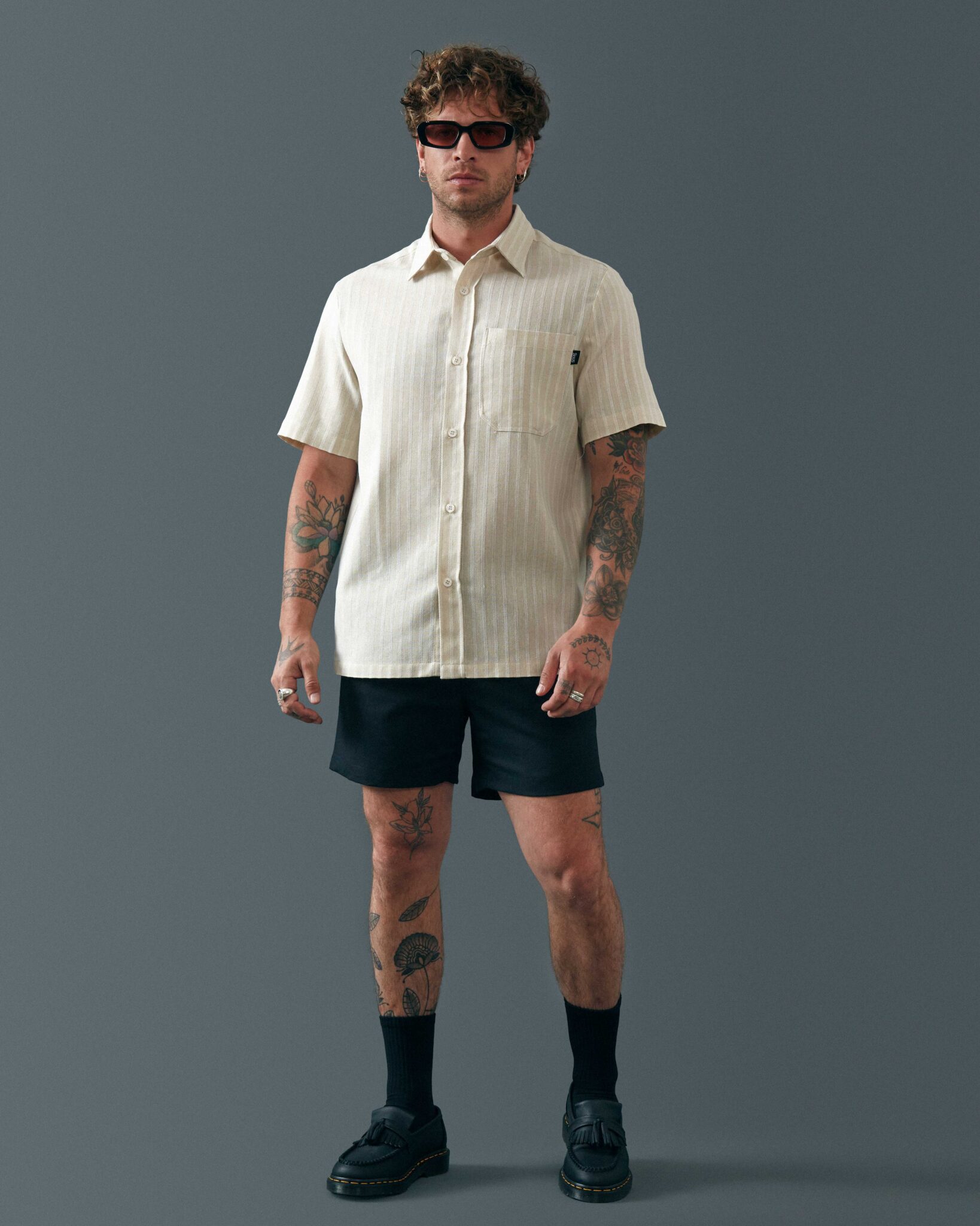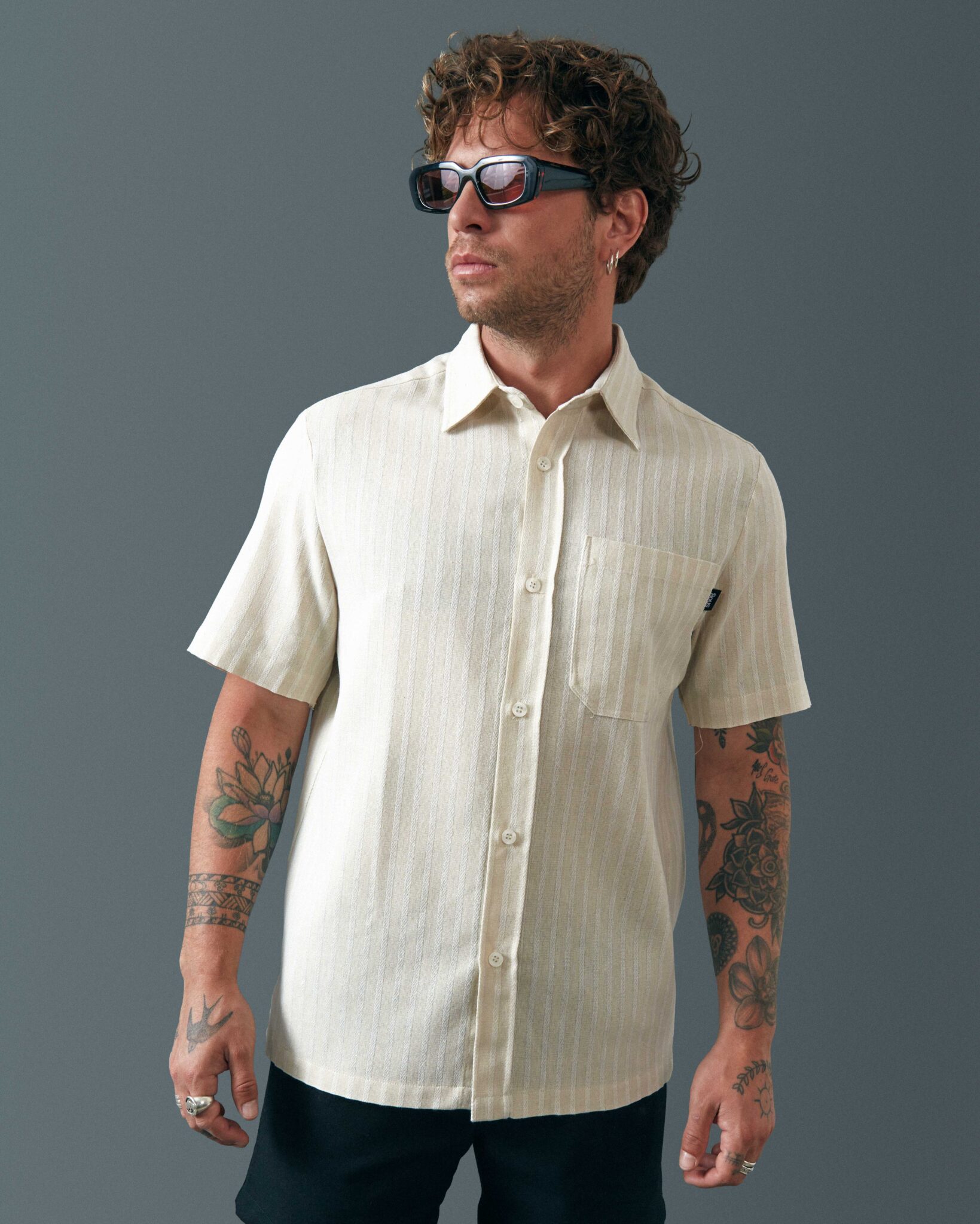 Camisa corte regular. 100% algodón. Fabricado por SNOG en nuestro taller de Santiago de Chile. Alan mide 1.73 y usa talla M en camisa.
